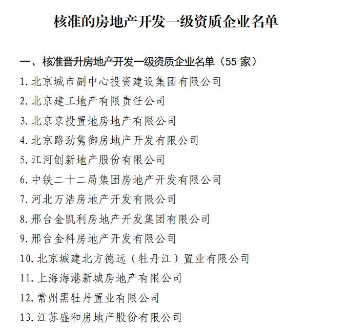 房地产开发资质分为两个级别,国家一级资质是最高级别,对企业的整体规模、开发业绩、施工质量、人员配备、从业年限等均有要求,获批难度较大。本次全省仅3家企业核准晋升房地产开发一级资质。