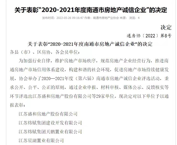 近日,南通市房地产业协会公布了关于表彰“2020-2021年度南通市房地产诚信企业”的决定。决定指出,协会秉承公开、公平、公正的原则,通过企业申报、材料审核、媒体公示、反馈核实等环节评选出伟德国际1946官网等29家单位,予以通报表彰。