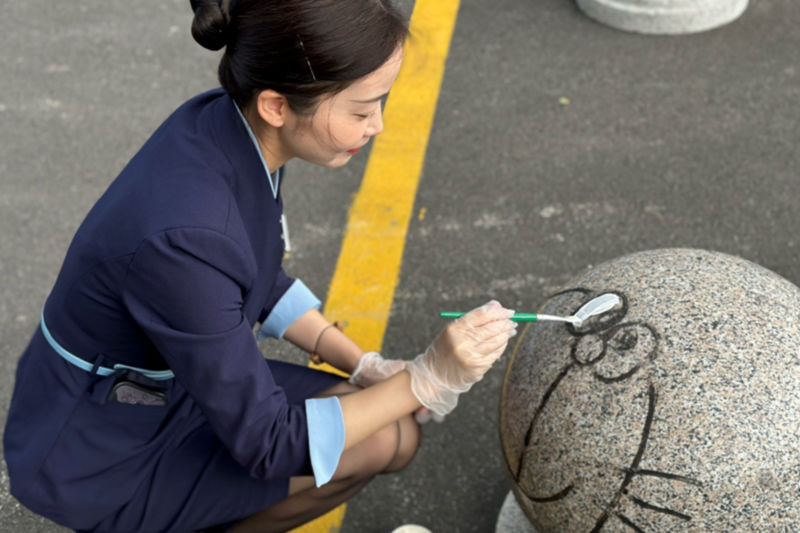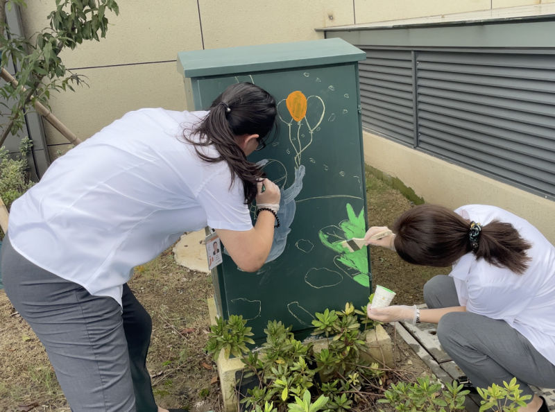 小区主出入口红旗飘飘、配上“欢度佳节”的红灯笼,浓浓的双节氛围在小区里渲染开来。悦家人化身“粉刷匠”妙手“粉刷”,他们扫去浮土、除去锈迹、勾勒轮廓、涂料应用于轮廓之中,在业主们归家的道路上、窨井盖、沿途石球及配电箱刷上各种美好的色彩,一幅幅生动有趣的画面跃然而现,配合上节日氛围布置,给业主们焕然一新的视觉冲击。