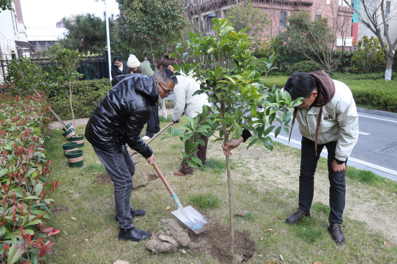 在植树现场,党员们热情高涨、干劲十足。他们齐心协力,有的挥锹铲土、有的扶直树苗、有的培实新土,还有的提桶浇水,每一个环节都一丝不苟。经过大家的辛勤努力,小树苗迎风而立。大家还将写好自己名字的认养牌挂在树苗上留作纪念,为春日的大地增添了一抹生机和活力。